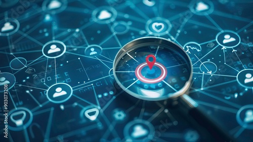 A close-up of a magnifying glass focusing on a digital map with interconnected nodes, symbolizing search and connectivity.