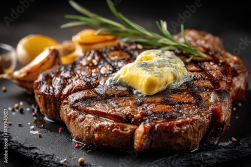 A close-up of a perfectly grilled steak, topped with melting butter, garnished with rosemary and roasted garlic cloves, presented on a black stone plate for a delectable meal.