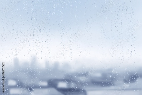 A close-up of a rain-soaked window with droplets, creating a blurred view of the city skyline. The mood is calm and reflective, perfect for conveying weather themes.