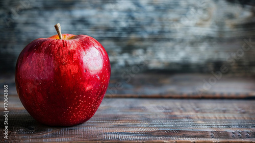 A close-up of a red apple against a dark wooden surface, showcasing the vibrant fruit against the textured background.