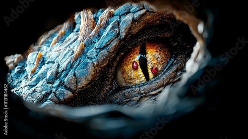 A close-up of a reptilian eye with vibrant colors and intricate textures.