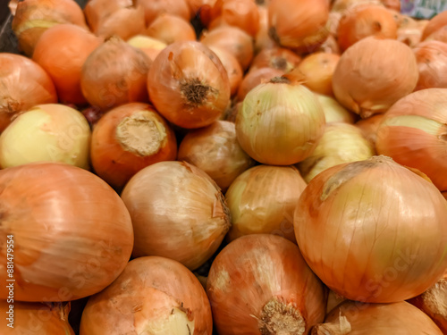 A close-up of a stack of golden onions showcases their layers of papery skin and smooth, rounded shapes.