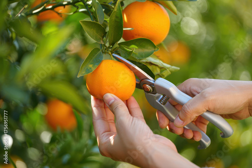 A closeup of hands carefully harvesting a ripe orange from a tree with pruning shears, capturing the essence of fresh, organic citrus fruit picking