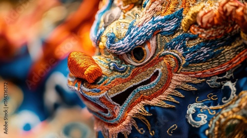 A close-up of intricate embroidery on the dragon's costume, showcasing the artistry of traditional craftsmanship.