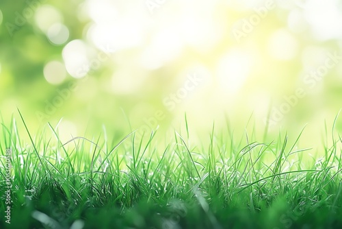 A close-up of lush, vibrant green grass swaying gently in the breeze, with sunlight filtering through it, creating an enchanting and serene scene