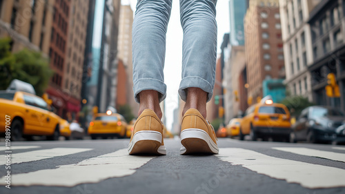 A close-up of shoes on a crosswalk in a bustling urban scene