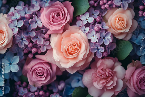 A close-up of various pastel roses and blossoms, arranged beautifully amidst delicate purple flowers, creating a vibrant floral display.
