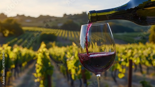 A close-up of wine being poured into a glass at a vineyard, with rows of grapevines visible in the background.
