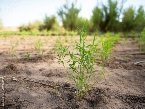 A close-up of young green plants sprouting from dry soil, surrounded by a landscape of sparse vegetation under a clear sky.