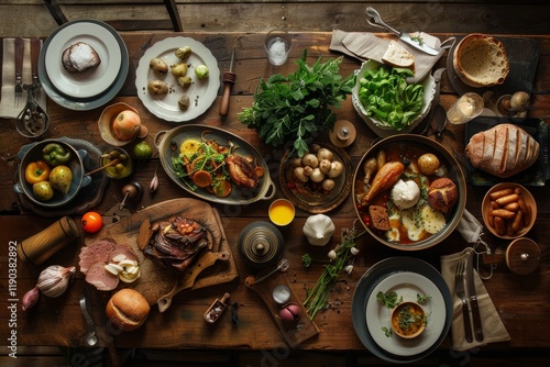 A close-up overhead view of a rustic farmhouse table laden with a variety of hearty comfort food dishes, Capturing the essence of comfort food through nostalgic ingredients and flavors