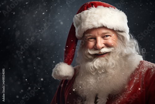 A close-up Santa Claus reveals his warm, benevolent countenance, marked by cheerful smile on snowy scene bokeh background, adding to enchanting ambiance of moment. Generative AI.