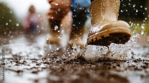 A close-up shot capturing muddy boots splashing through a puddle, embodying the essence of outdoor play and the thrilling enjoyment of rainy day activities.