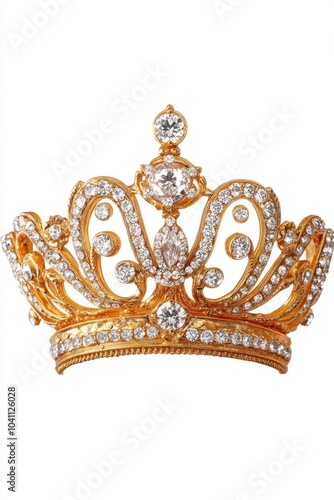 A close-up shot of a gold crown adorned with diamonds against a plain white background