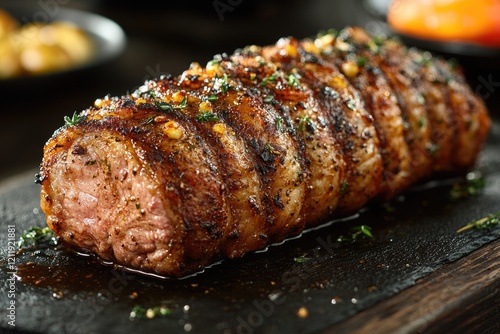 A close-up shot of a large piece of fresh meat placed on a clean cutting board, ready for preparation or cooking