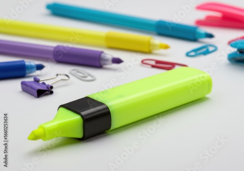 A close-up shot of a neon yellow highlighter pen, with other vibrant pens and paper clips nearby. Focus is on the highlighter