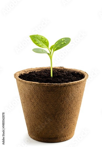 A close-up shot of a small plant with water drops, growing in a rustic pot against white.