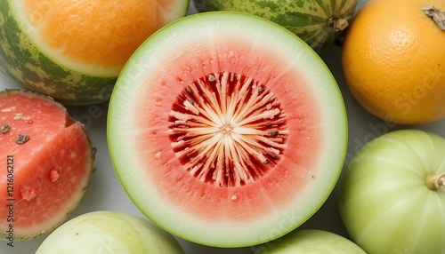 A close-up shot of a variety of vibrant and juicy fruits, including watermelon, cantaloupe, and orange, arranged together showcasing their natural colors and textures.