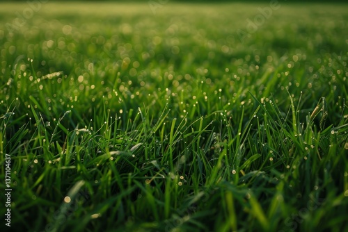 A close-up shot of dew-covered grass blades in a field, bathed in the soft light of dawn, Seemingly endless field of grass stretching out before you