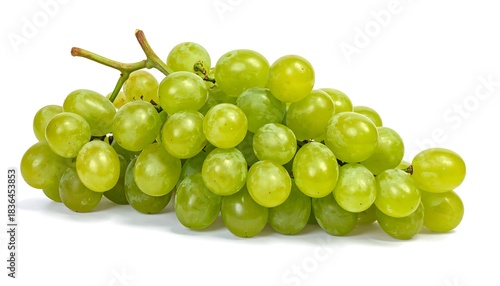 A close-up studio shot of a bunch of pale green, ripe, seedless fruit. They are on stems with leaves, set against a white backdrop