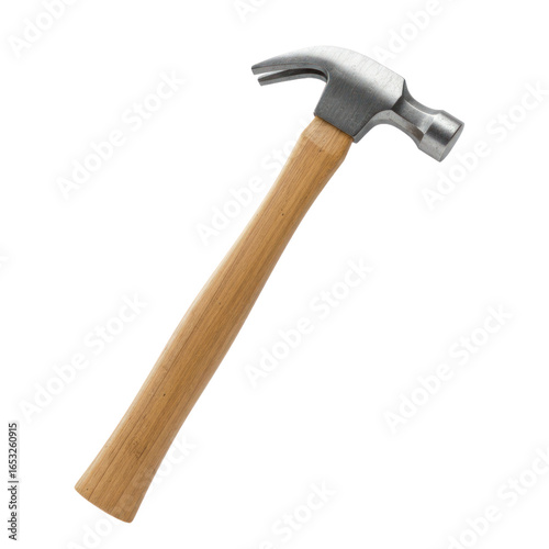 A close-up view of a classic claw hammer with a light wooden handle and a metallic head.