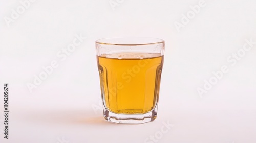 A Close-Up View of a Clear Glass Filled with Golden Yellow Liquid on a Light Background, Perfect for Beverage Themes, Refreshment, and Lifestyle Concepts