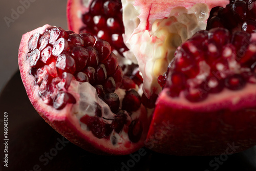 A closeup view of a cut pomegranate.