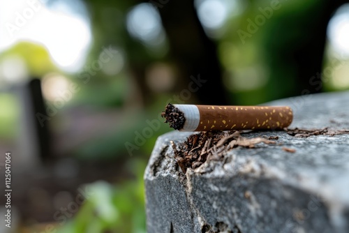 A close-up view of a discarded cigarette on a weathered stone surface, contrasting against a blurred green background, evoking themes of neglect and the impact of smoking.