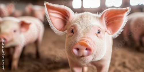 A close-up view of a piglet inside a barn looking curiously into the camera, highlighting the innocence and everyday life of farm animals on rural farms.