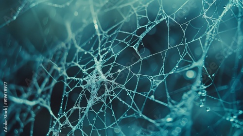 A close-up view of a spider web with dew drops, symbolizing nature's intricate design, fragility, and beauty. The web is delicate and intricate, highlighting the fine details of nature. The blue hues