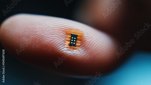 A close-up view of a tiny microchip resting on the tip of a human finger, showcasing advanced technology and precision engineering in a modern context