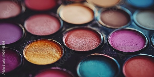 A close-up view of a variety of colorful eyeshadows in a compact case