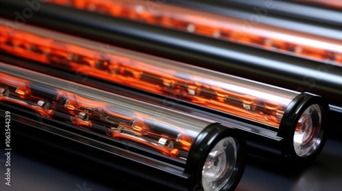 A close-up view of orange liquid flowing through a series of transparent tubes encased in black housings.