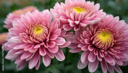 a cluster of blooming pink chrysanthemums on a background of soft green tones the petals of the chrysanthemum are stacked in layers with a yellow stamen in the center which looks particularly brigh
