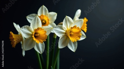 A cluster of delicate white daffodils with vibrant yellow centers, elegantly arranged against a dark backdrop, showcasing their pristine beauty and subtle contrast.