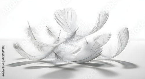 A cluster of delicate white feathers softly scattered, casting gentle shadows on a bright background.