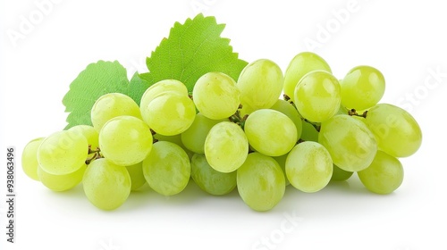 A cluster of fresh green grapes with leaves isolated on a white background.