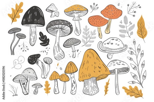 A collection of colorful mushrooms and leaves arranged on a plain white background