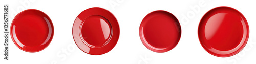 A collection of four red round ceramic plates arranged neatly on a plain white background creating a simple and minimalist composition