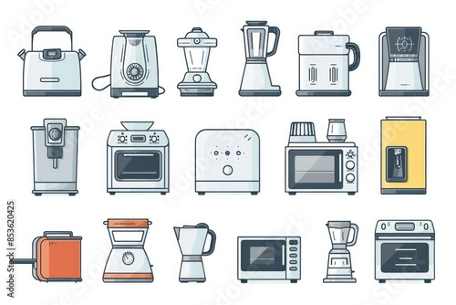 A collection of kitchen appliances and utensils arranged on a white background