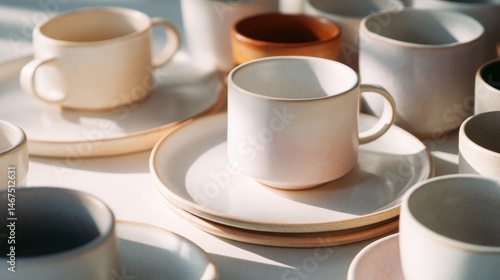 A collection of minimalist ceramic cups and plates arranged on a sunlit table, showcasing elegant design
