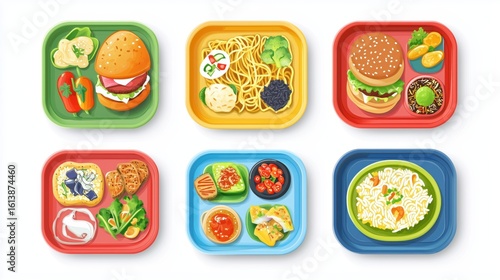 A collection of six colorful trays with a variety of international and fast food dishes, made in a modern flat design, for cafeteria menus, nutrition education and catering projects