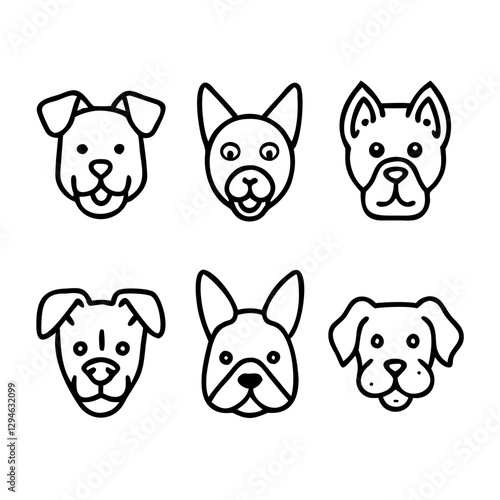 a collection of six stylized dog head icons, each representing a different breed. The icons are minimalistic and monochromatic