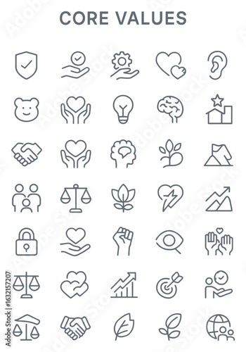 A collection of thin line icons representing core values for business and personal principles.