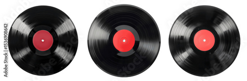 A collection of three vintage vinyl records, showcasing their classic black design with red centers, ideal for music enthusiasts.