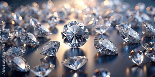 A collection of various cut diamonds is displayed on a reflective surface, catching the light and creating a stunning visual effect