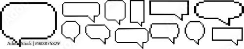 A collection of various pixelated speech bubbles and thought bubbles, rendered in a simple black outline on a white background. The set includes different shapes such as rounded rectangles, squares, o