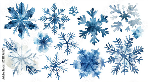 A collection of watercolor snowflakes in various shapes and sizes, predominantly in shades of blue