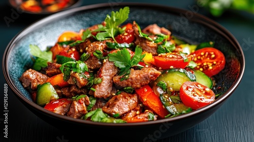 A colorful beef stir-fry featuring fresh vegetables like bell peppers and cherry tomatoes, garnished with herbs, perfect for a delicious meal on any occasion.