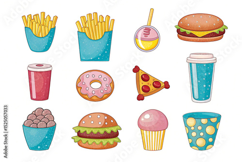A colorful cartoon illustration featuring twelve assorted fast food items including burgers, fries, pizza, donuts, soda, and other treats
