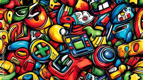 A colorful doodle pattern featuring old-school video game controllers, pixelated characters, and arcade screens, with neon pixel grids and vibrant backgrounds, playful and nostalgic, hd quality,